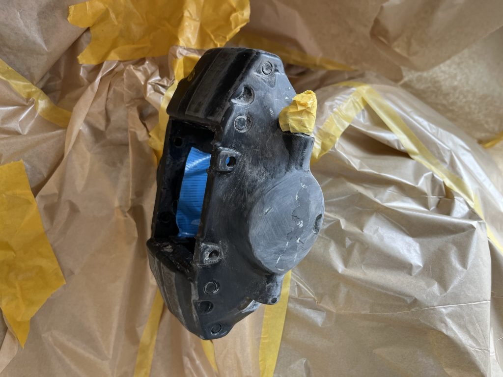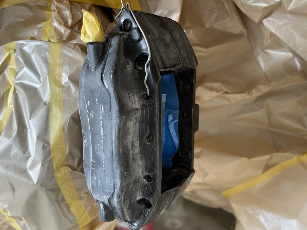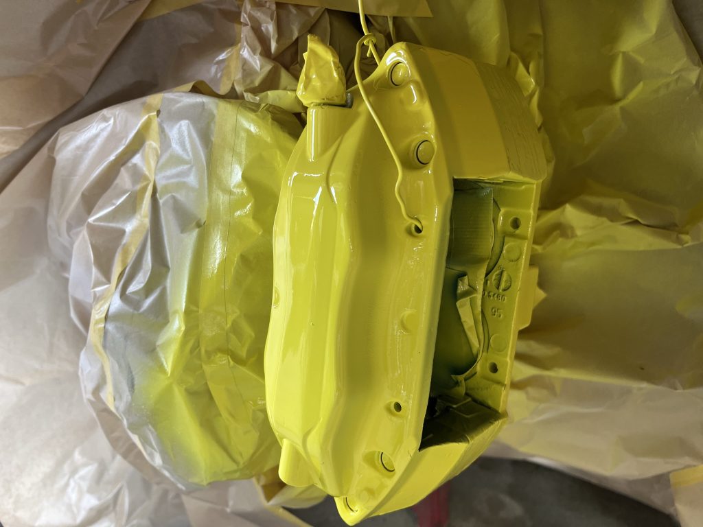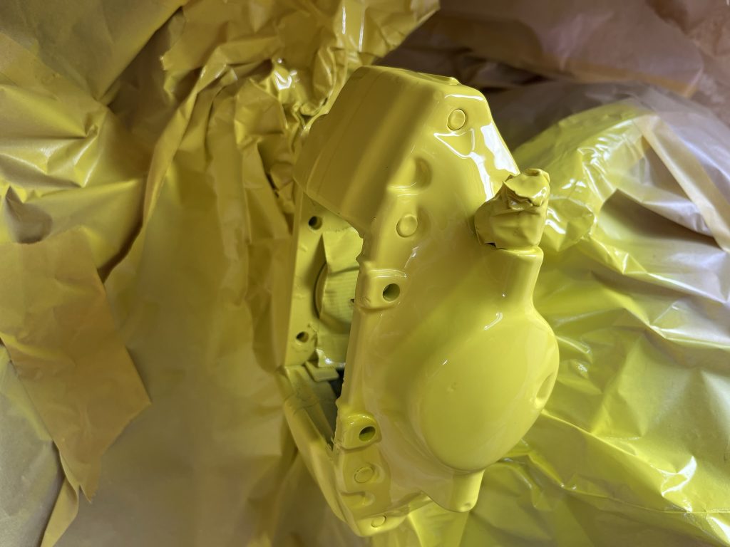 - キャリパーを足回りから外し、脱脂・下処理後、下色白→蛍光イエロー→クリヤ塗装